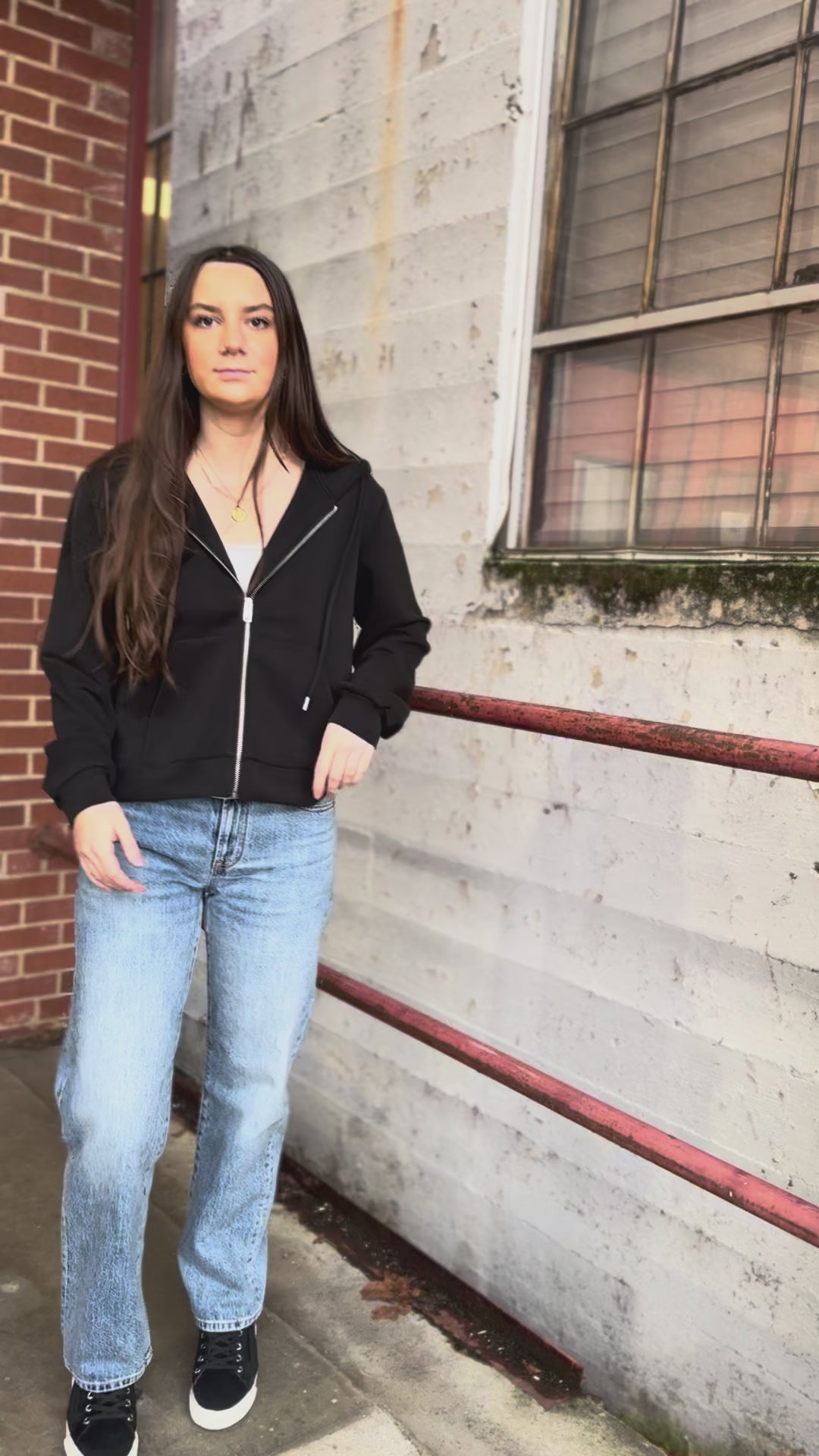 A full-zip hoodie with a buttery-soft modal fabrication. Wear over a basic or by itself and complete the look with joggers or biker shorts.