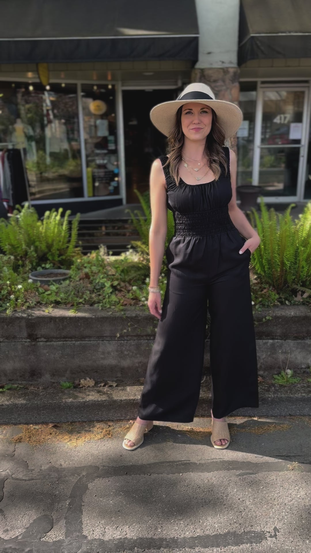 This Amana jumpsuit is a versatile summer garment, featuring a tank style, scoop neck, gathered waist, and wide leg for ultimate comfort.