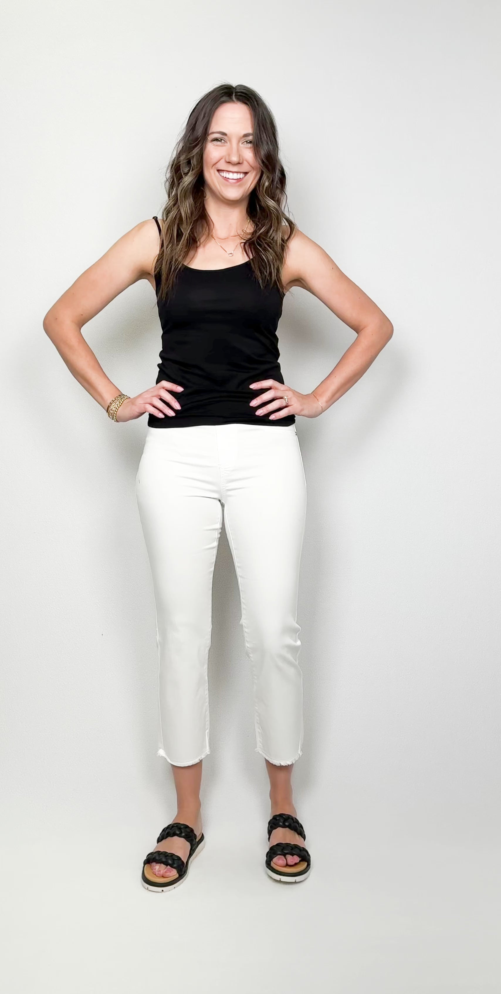 This elastic waist pull-on pant has no zippers or buttons for comfortable, all-day wear. With back pockets and a frayed hem, these straight crop jeans fit like a dream and stretch in all the right ways.