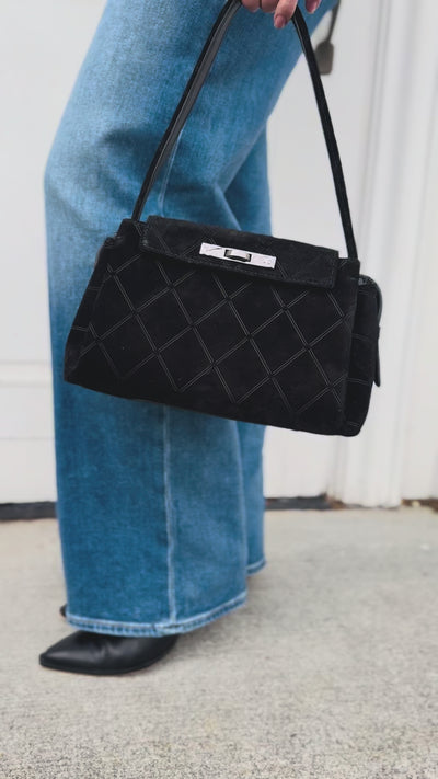 - Crafted with a deep black Italian suede with a unique doubled diamond embossing effect and black pebble leather accents