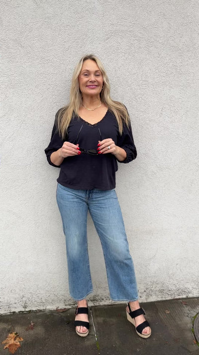 The Chloe V-Neck combines timeless elegance with refined details. Crafted from 100% cotton for breathable comfort and durability, this piece features a flattering v-neckline accented with delicate lace trim. Intricate lace detailing adorns the sleeves, adding a touch of sophistication to an everyday essential. The classic black hue ensures versatility, making it an effortless addition to any wardrobe.