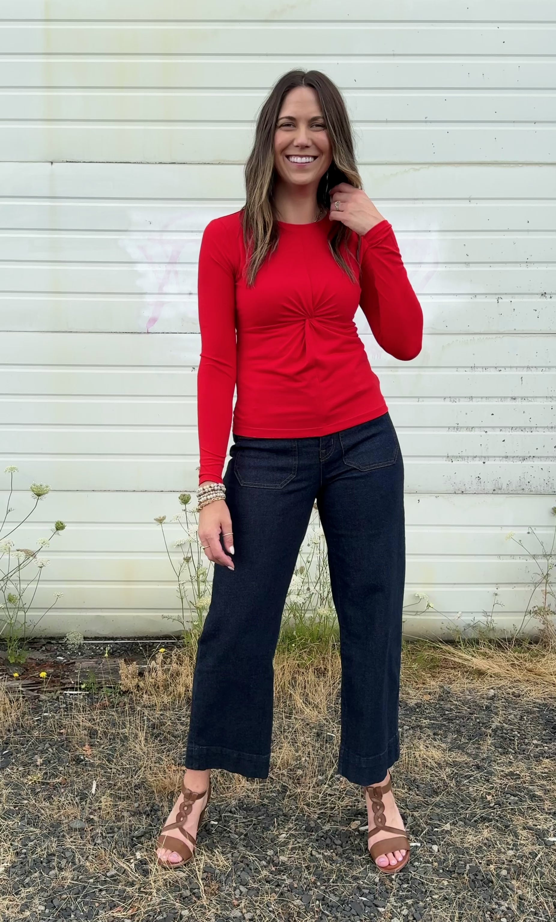 If you're looking for a stylish and versatile piece to add to your wardrobe, this knit top might just be what you need. The twist front detail adds a unique touch to the classic design, making it a statement piece that can easily elevate any outfit.