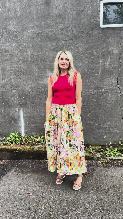 The Daphne Dress from Brave & True is a gorgeous classic style, and this version has a Garden print, making it extra striking. It features a crew neckline, no sleeves, and a dropped waistline on the bodice. This bodice is stretch cotton jersey, so it has a fitted silhouette but with comfort, not constriction. The full skirt has a subtle crinkle feel to it, concealed pockets, and has side splits from the knee for extra breeziness. The Daphne Cotton Dress is perfect for layering under a jacket, but also stands alone and can be styled up or styled back.