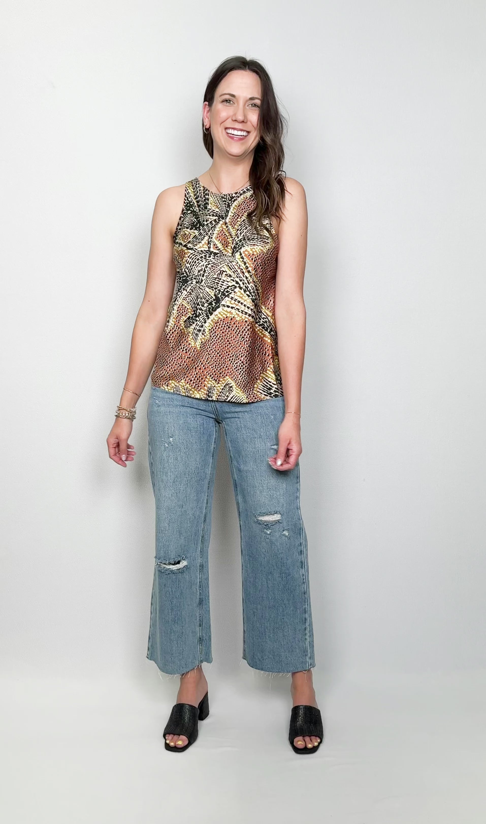 A dressier tank for social occasions or a quick throw on to elevate your favorite pair of jeans? The choice is yours. The print is a uniquely tessellated take on botanical, with sophisticated neutrals and black so you can wear it with black pants. The shape is timeless and contemporary with a boat neck in front and back to make things a little dressier. With just the right amount of stretch and a hem designed to sit at the hip.
