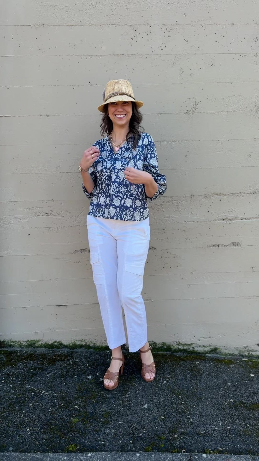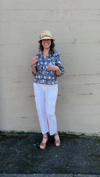 Crafted from soft cotton with an elegant block print in serene blue florals, this three-quarter sleeve top features a flattering V-neckline and delicate shirring for refined comfort and movement. A timeless piece that effortlessly transitions from day to evening.