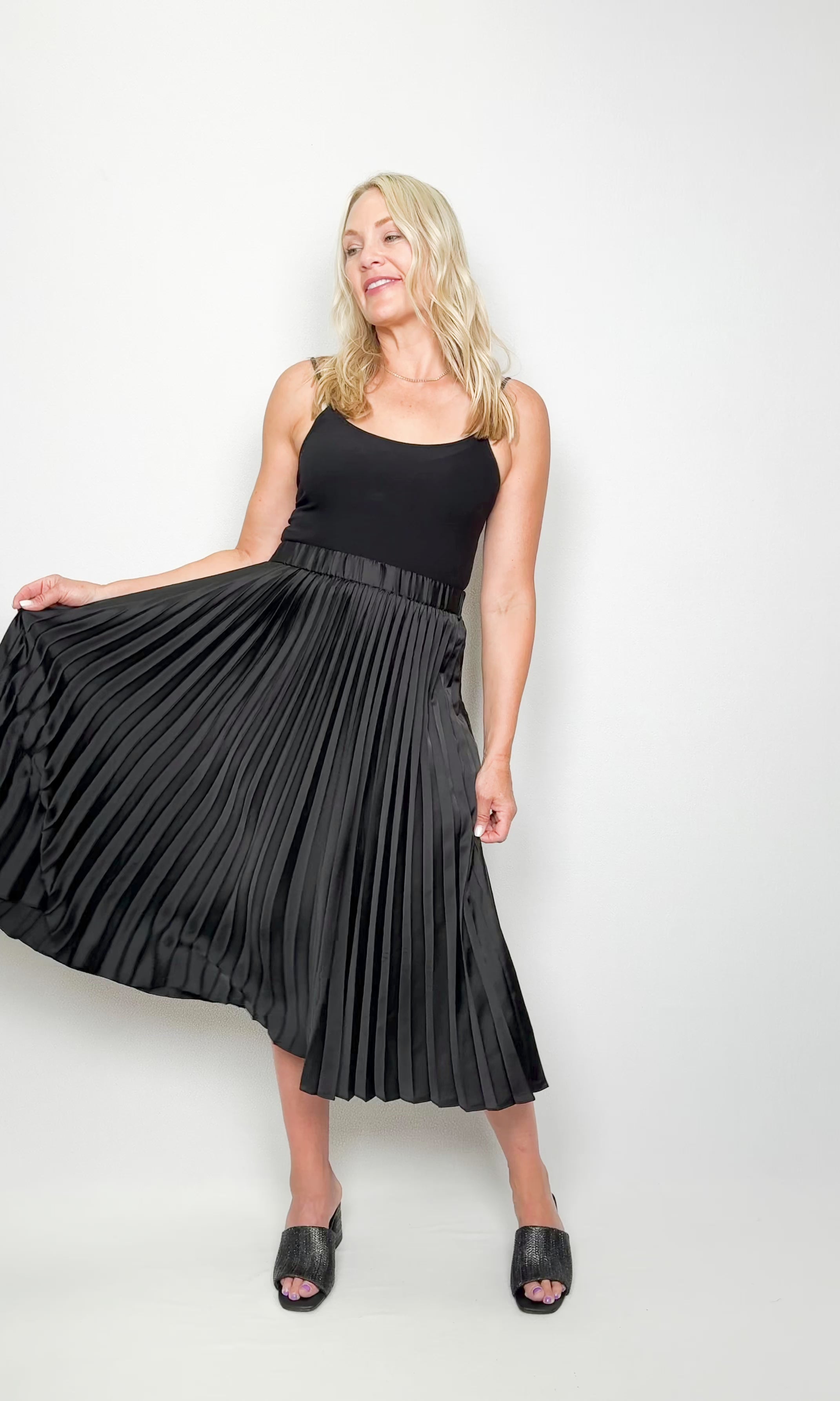 This midi-length satin skirt is a versatile piece that can add a touch of elegance to any outfit. Its smooth, silky texture is perfect for dressing up or down, making it a go-to style for any occasion. Whether you pair it with a blouse or sweater, this skirt can easily transition from day to night. Its length is both stylish and practical, providing coverage while still showing off your shoes. The satin material catches the light beautifully, making you stand out in any crowd. With its timeless design and effortless style, this skirt is a must-have in any fashion-savvy person's wardrobe.