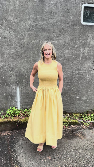 Gladys reimagines the classic drop waist dress with a fitted, smocked bodice, softly gathered skirt, and lightweight fabric that drapes beautifully while holding its shape. In a soft white, this is an elevated everyday style that feels effortless and refined for warm weather—and travel—on the horizon.