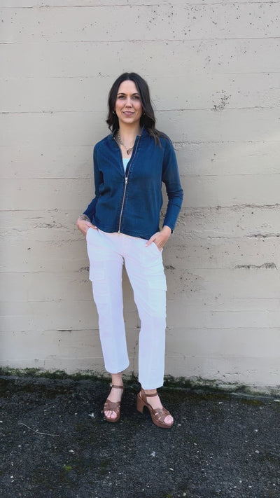 Crafted from premium denim, this Jodi jacket features a streamlined zip front and distinctive zip sleeve detailing for effortless layering. The refined silhouette combines classic construction with modern functionality, making it an essential piece for any curated wardrobe.