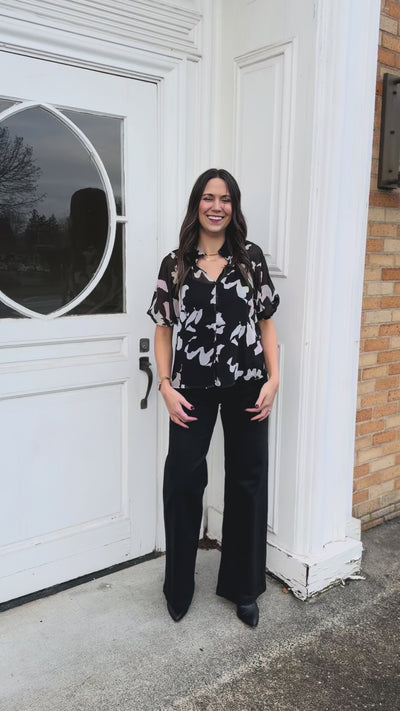 This elegant blouse, designed for women, features a flattering V-neck and stylish puff sleeves. Crafted from comfortable polyester, it offers a relaxed fit perfect for everyday wear. The unlined design and button closure add to its effortless appeal. With a 24-inch garment length, this short-sleeved top is versatile enough to pair with various bottoms.