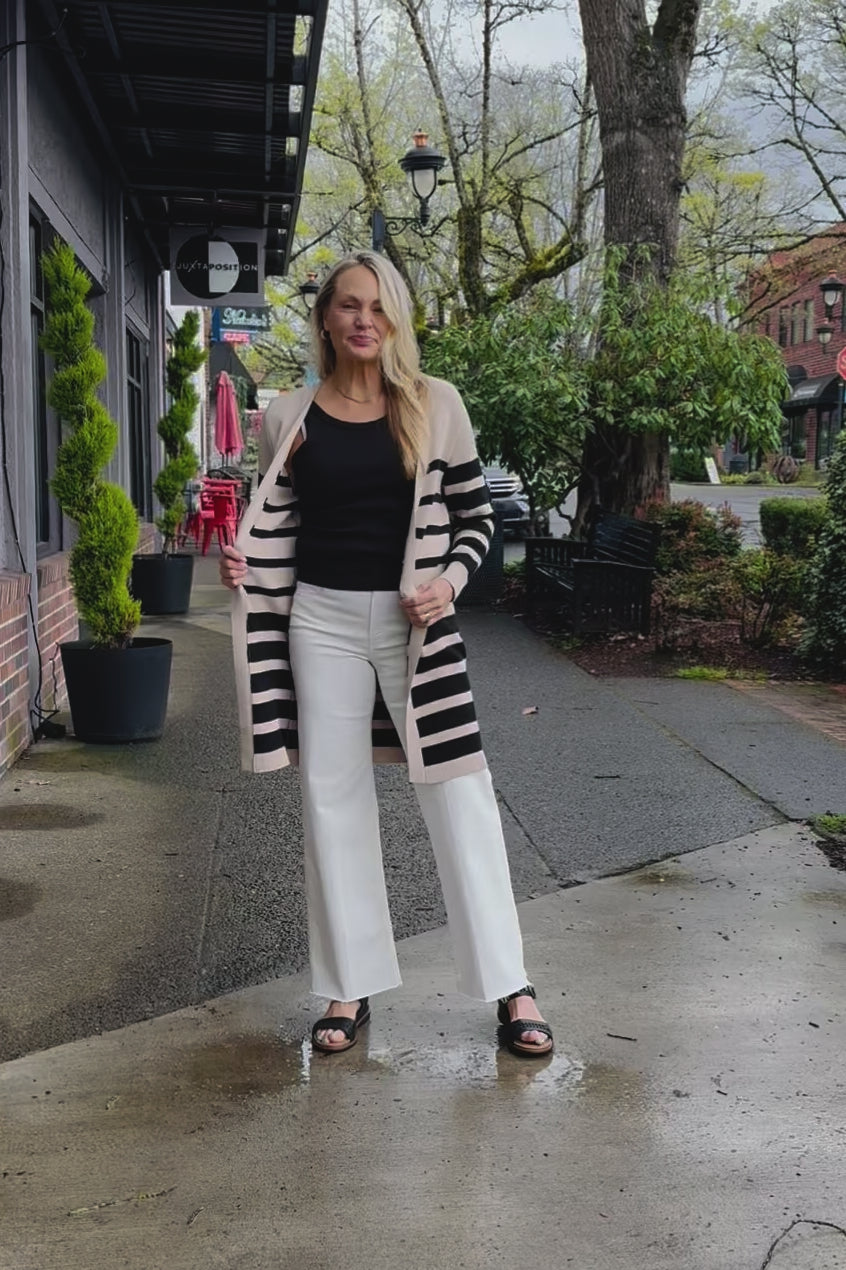 This long and lightweight cardigan is punctuated with bold stripes. It's a great addition to your wardrobe and perfect for grabbing on the go.