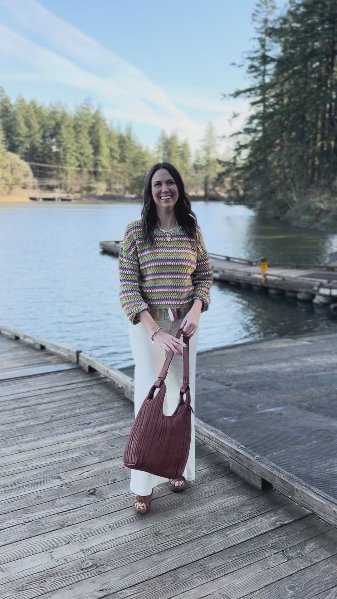Crafted with a refined stripe knit pattern, this long sleeve sweater features distinctive bell sleeves and charming fringe detailing along the hem for an elevated, textured finish.