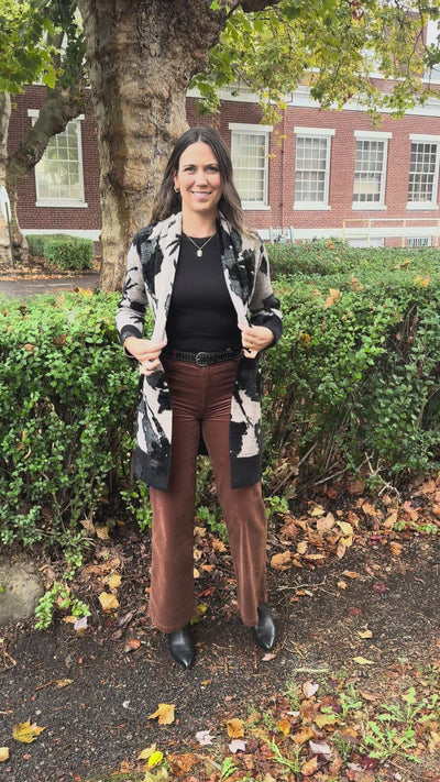 This Jacquard long cardigan effortlessly combines modern style with classic comfort. The striking abstract print contrasts beautifully with the soft texture of feather yarn, while long straight sleeves frame the piece. A boxy silhouette adds an easygoing touch, making it the perfect choice for effortless, everyday style