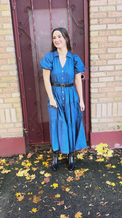 A tiered ruffle skirt brings flouncy movement to this denim maxi updated with puff sleeves for volume and charm.