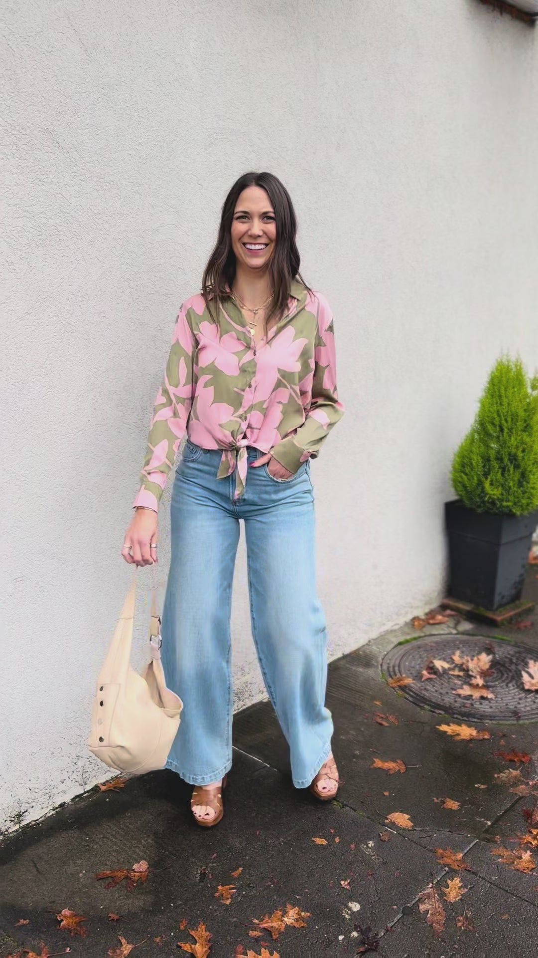 This is the perfect blouse for a date night, Holiday or Vacations! Love this green and Pink Combo with with button down front and tie! So many outfit options