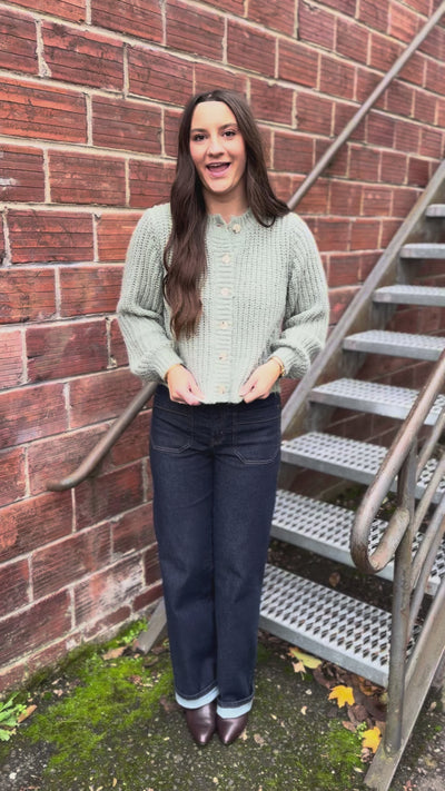 Elevate your layering game with the Lumi Crew Neck Cardi, where sophisticated design meets tactile comfort. This cropped cardigan showcases a substantial chunky knit in soft sage, punctuated by vibrant multicolored stripes along the sleeves for visual interest. Versatile styling options abound—fasten the buttons for a refined, put-together aesthetic or leave it unbuttoned for an approachable, relaxed vibe that works across multiple occasions.