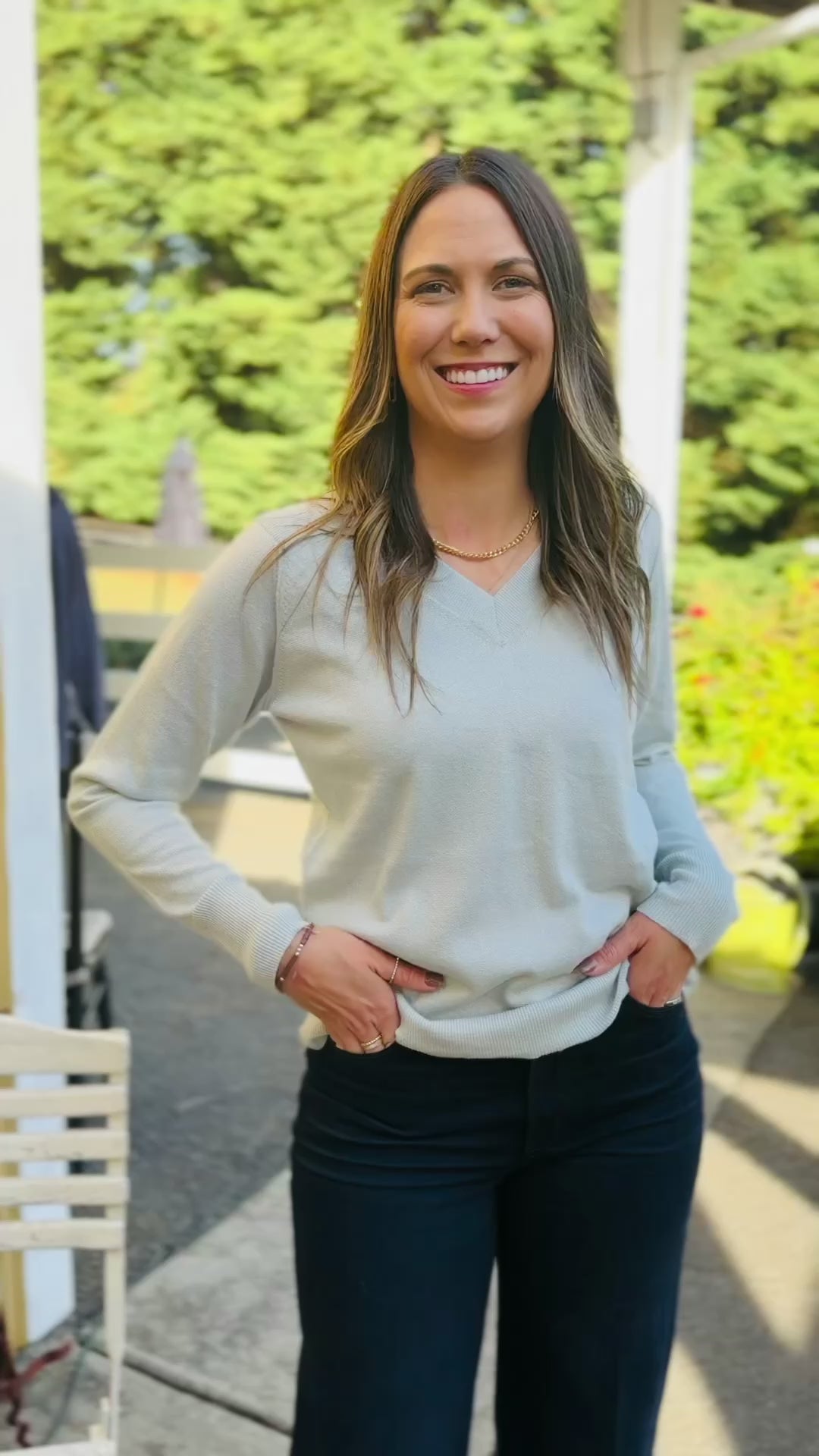 Elevate your wardrobe with the Pure Amici Metallic V-Neck Sweater in Petal. This sweater boasts a flattering V-neckline and chic metallic shine, making it the perfect addition to your stylish wardrobe. Its cozy long sleeves, subtle side slits, and sleek back seam detail offer both comfort and style in any setting. Don't miss out on this must-have piece for a fashion-forward look!