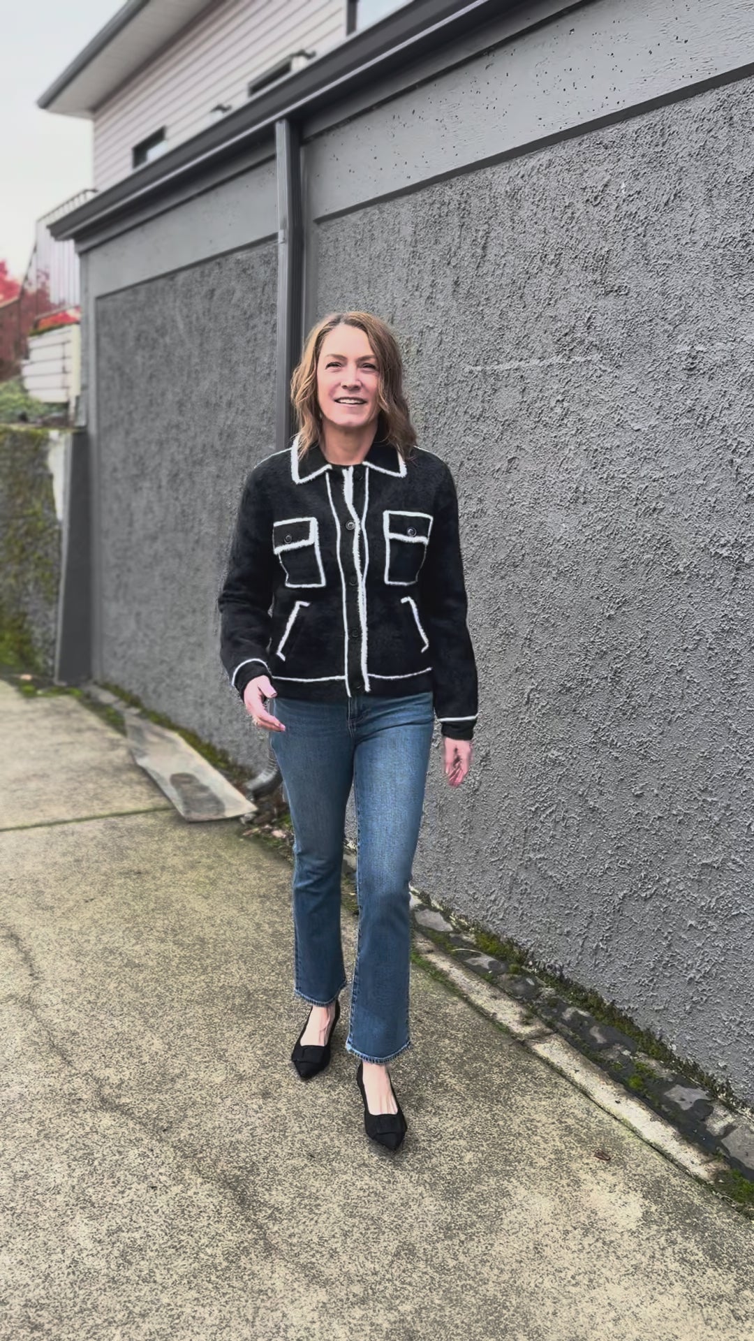 The Madison Jacket in black features finely outlined details and an exceptionally soft texture. Its button-front design stands out as a remarkable highlight.
