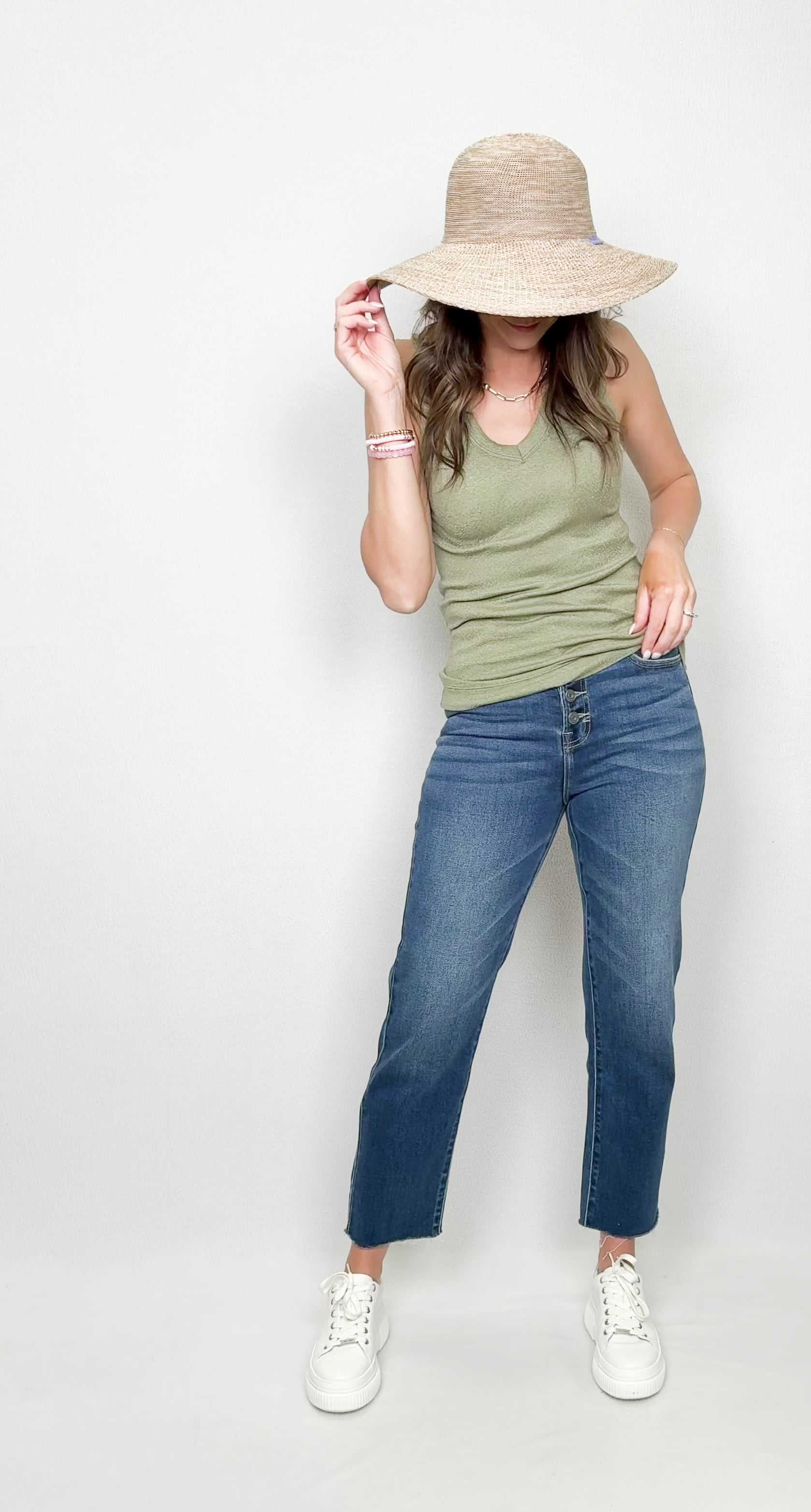 A fitted tank with a v-neck and wide binding, Maya has a slight, eye-catching sheen, thanks to the fabric that made us famous.