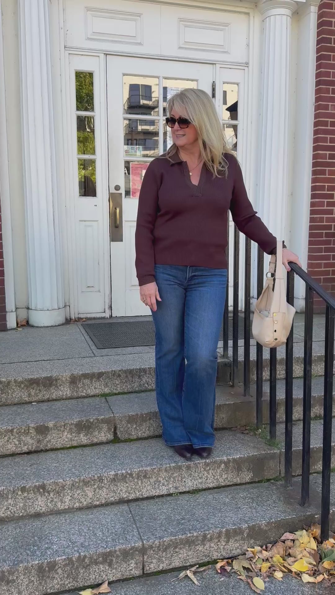 The Mimi L/S Top is designed with a turn-back collar and a half placket, featuring a slim fit that contours the body. It has full-length sleeves and distinctive contrast detailing on both the collar and cuffs.