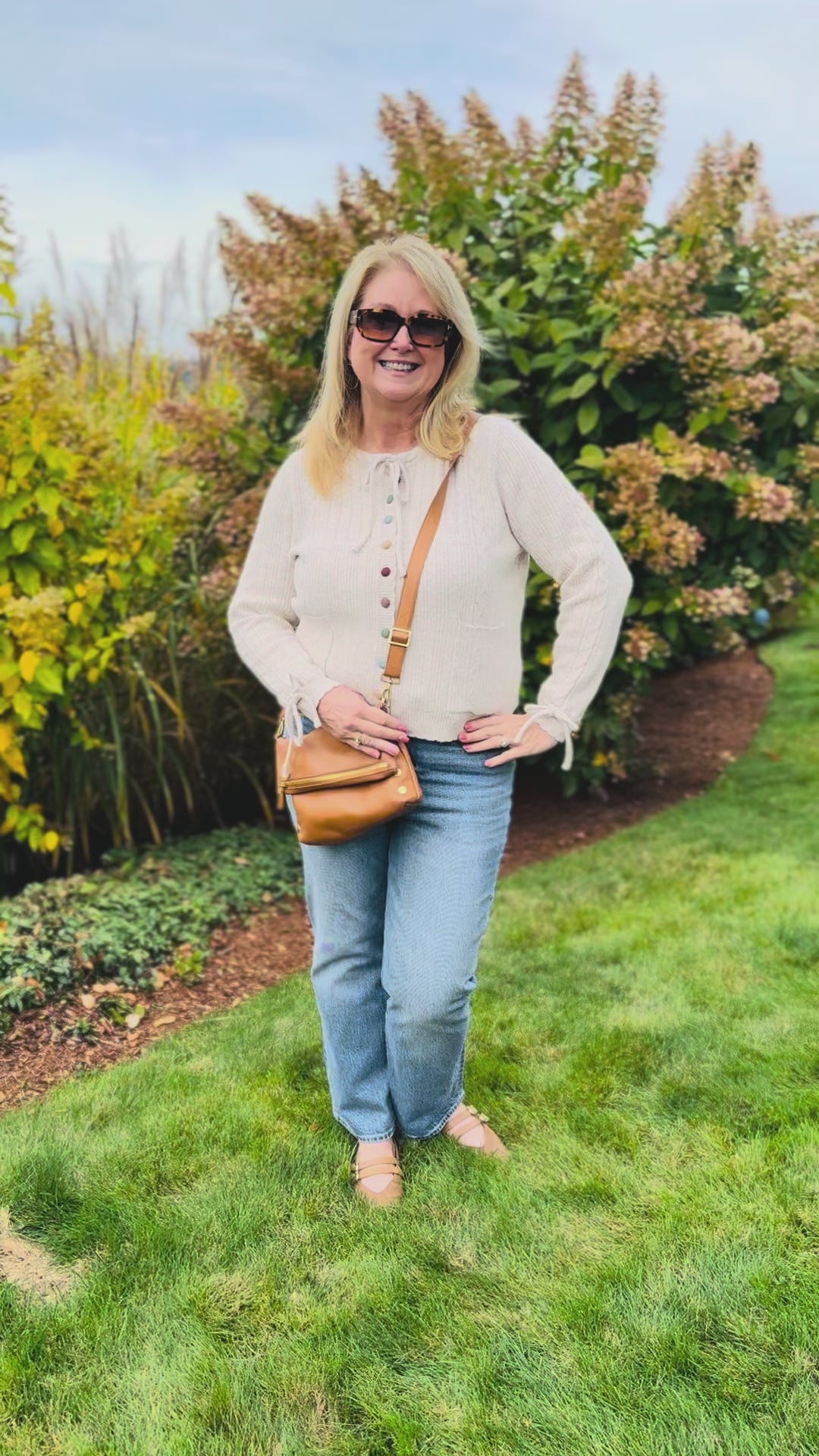 This women's cardigan features soft knit fabric with multicolored buttons and a round neckline with a front tie. Crafted from patterned woven material, it is detailed with scalloped edges and threaded bows on the sleeves and neckline for a refined finish.