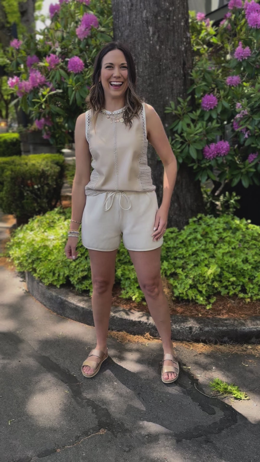 With a blend of faux leather and crochet, the Naru Tank top combines edge and elegance. This sleeveless crew neck top is perfect for adding unique texture to any outfit. Embrace the art of mixed media with a touch of crochet.