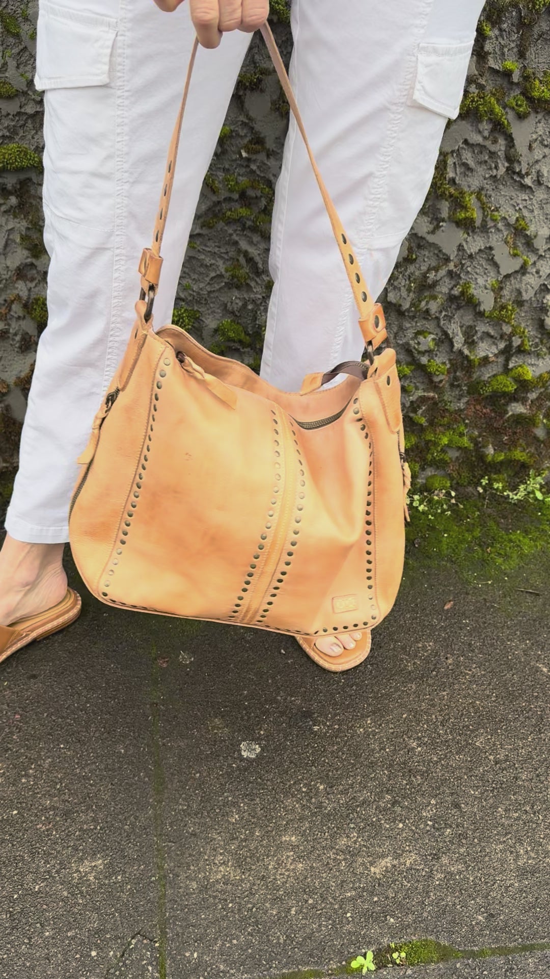 Packet LTC is a shoulder tote bag designed with both style and security in mind. Adorned with metal studs for a touch of edge, this bag features a fold-over flap that covers the zipper, ensuring your belongings stay safe. An outer zipped pocket adds extra convenience, making Packet LTC perfect for everyday use or as your go-to travel tote. Crafted from quality leather, it offers both durability and a bold look.