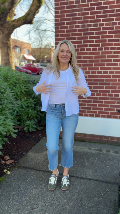 This refined long sleeve linen button down features a traditional straight collar design with a below-hip hemline providing optimal coverage. The enduring quality and timeless silhouette ensure this piece will remain an essential wardrobe staple for multiple seasons. Average length body.