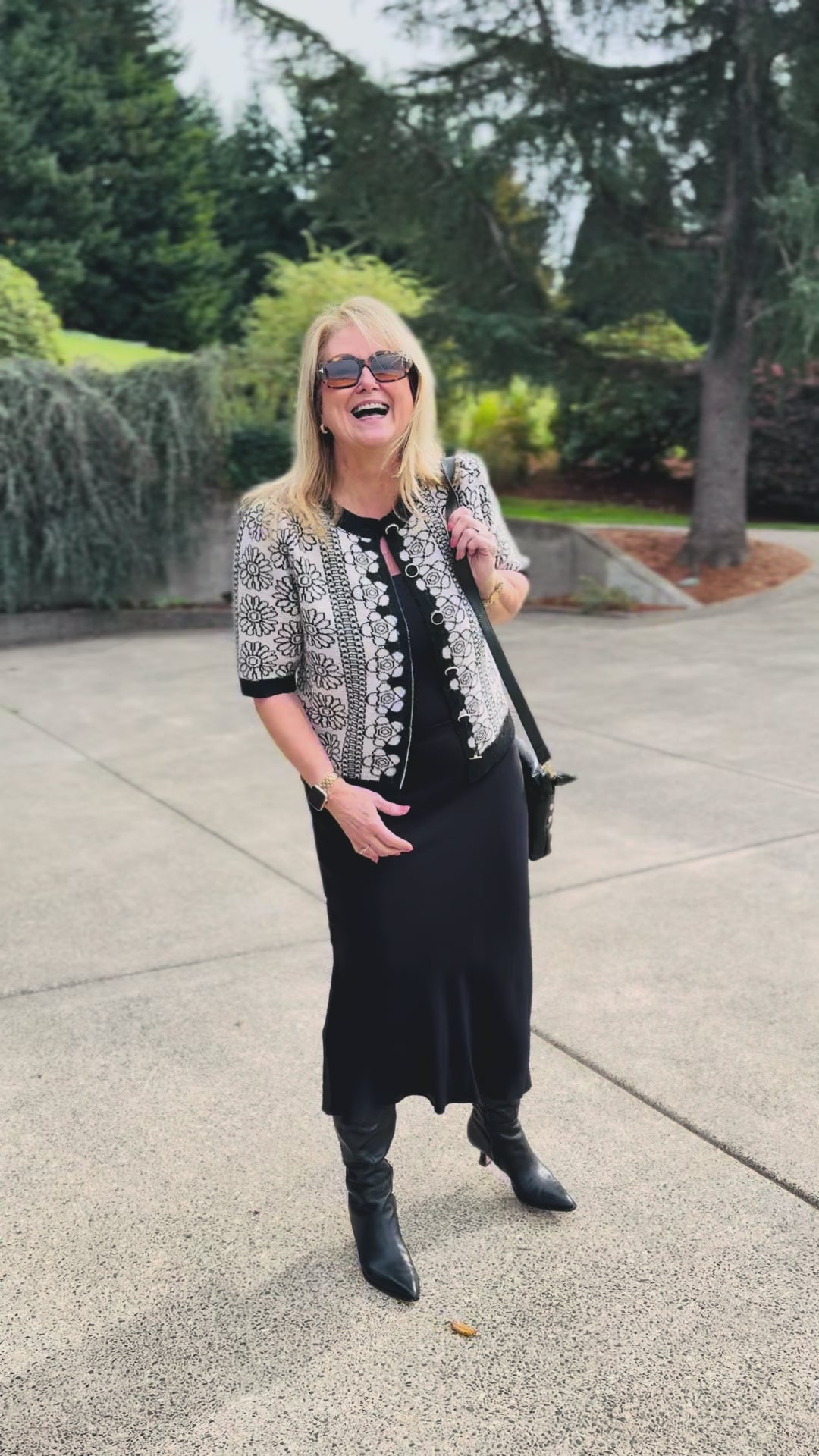 This short-sleeve sweater features a stylish abstract pattern in elegant Cream and black shades. Perfect for layering or wearing on its own.
