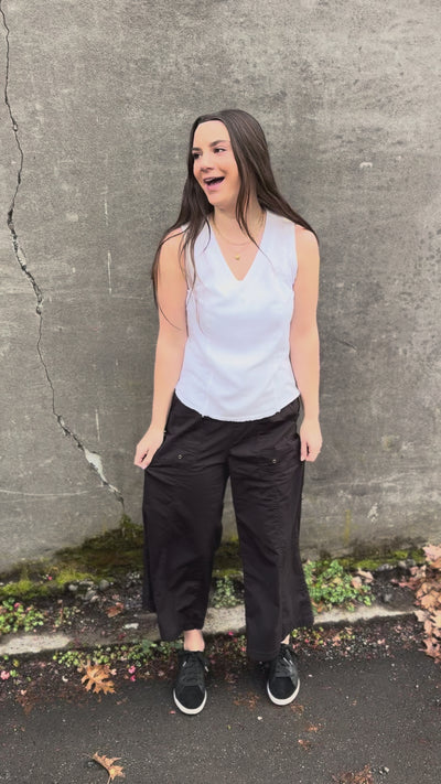 Crafted with refined simplicity, this jersey tank features an elegant v-neckline paired with a structured twill front panel and artfully finished raw edge hem for understated sophistication.