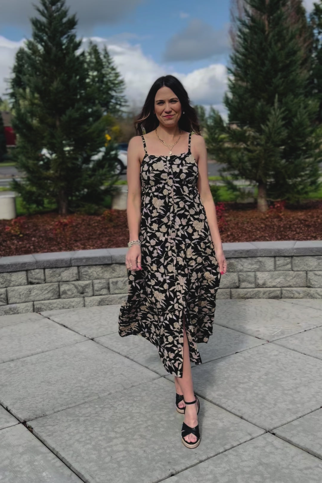 The Tiered Picot Dress is a flowy maxi dress with a square neckline. It features a 2-tier design, front buttons, and a relaxed fit.