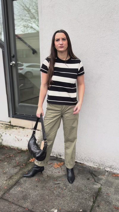 Elevate your everyday wardrobe with this versatile essential. The classic vanilla and black stripe pattern pairs seamlessly with virtually any ensemble, whether worn solo for understated sophistication or layered beneath outerwear for added dimension. Crafted with a refined crew neck and short sleeves, this piece delivers both style and practicality for the discerning dresser.