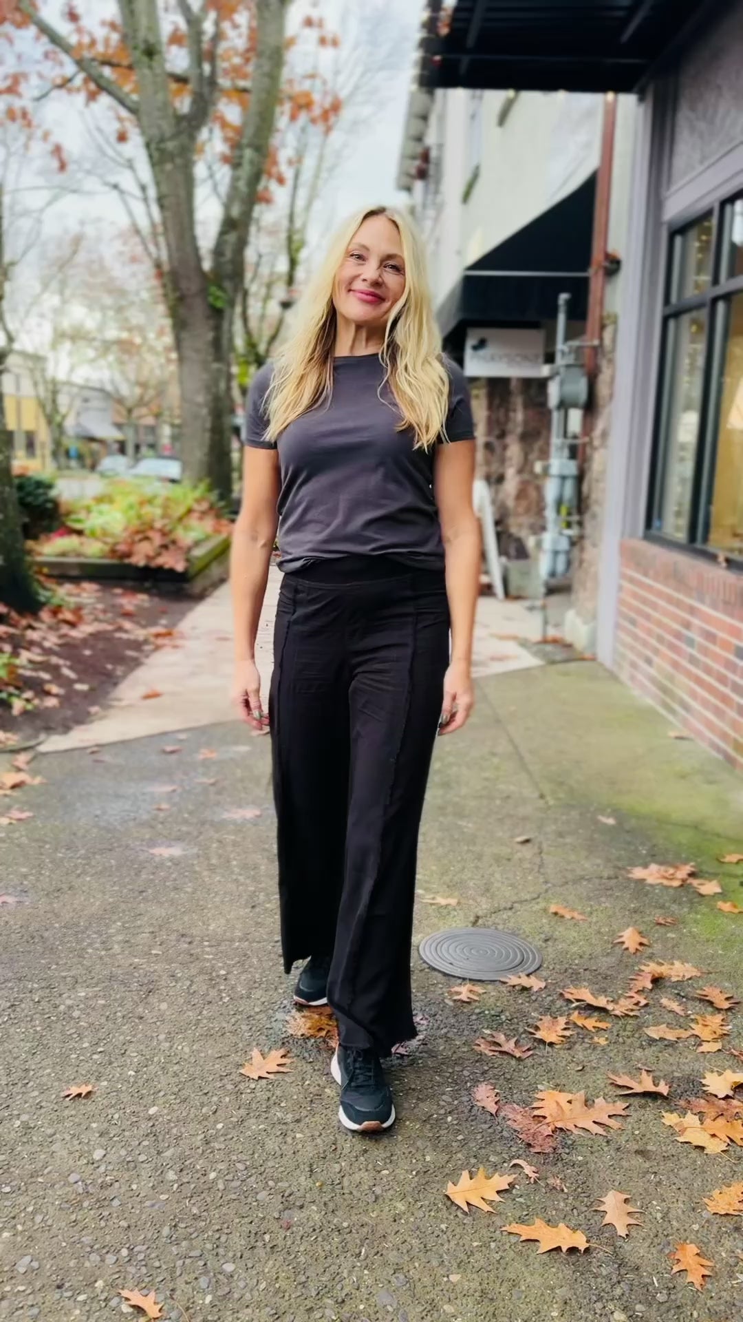 This wide leg trouser is now in our super soft Taissa. A pull-on elastic waistband and a faux fly, style lines with raw edges, back pockets, and raw edge hems.