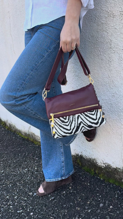- Crafted with a bold, black and white natural raffia with dynamic texture and a deep, oxblood red pebble leather with brown and red undertones