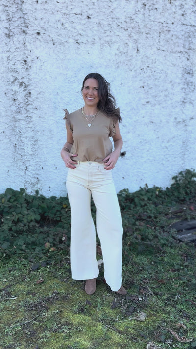 This refined crewneck features distinctive ruffled sleeves that add contemporary flair to an understated silhouette. The soft camel tone offers versatile styling potential, pairing effortlessly with both casual and elevated pieces. A thoughtfully designed piece that balances playful detailing with timeless appeal.